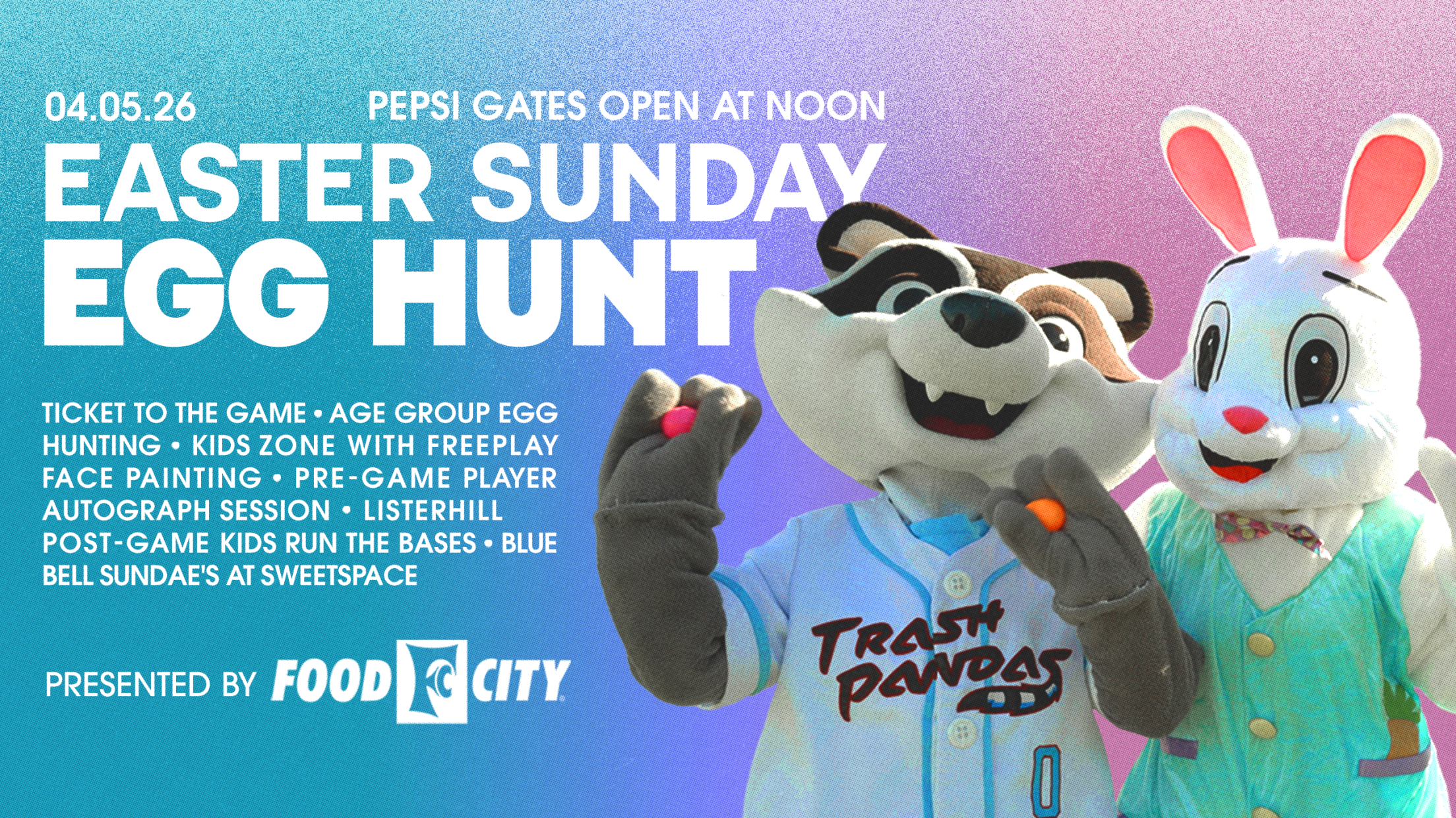 - Easter Egg Hunt: Kids are invited onto the field postgame for an Easter Egg Hunt, presented by Food City. Age groups include under 4, 5–8, 9–12, and 13+. A total of 20 grand prizes will be hidden in eggs, including autographed baseballs, first pitch opportunities, game-worn jerseys, Trash Cash, and more.